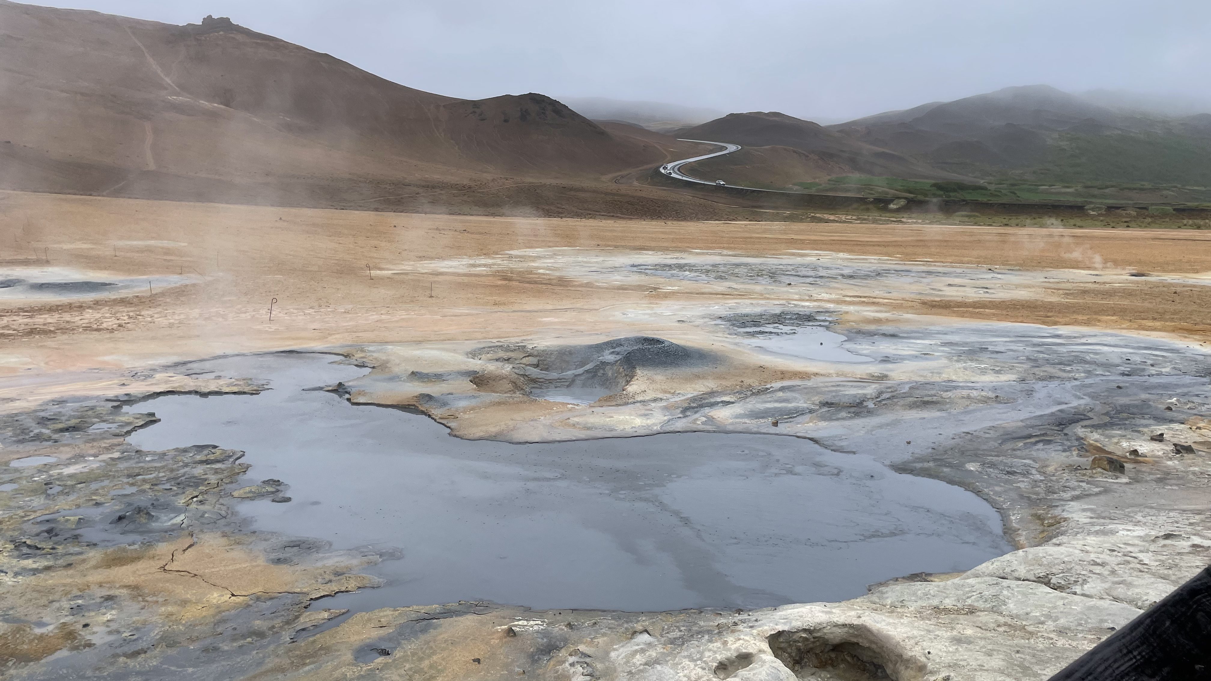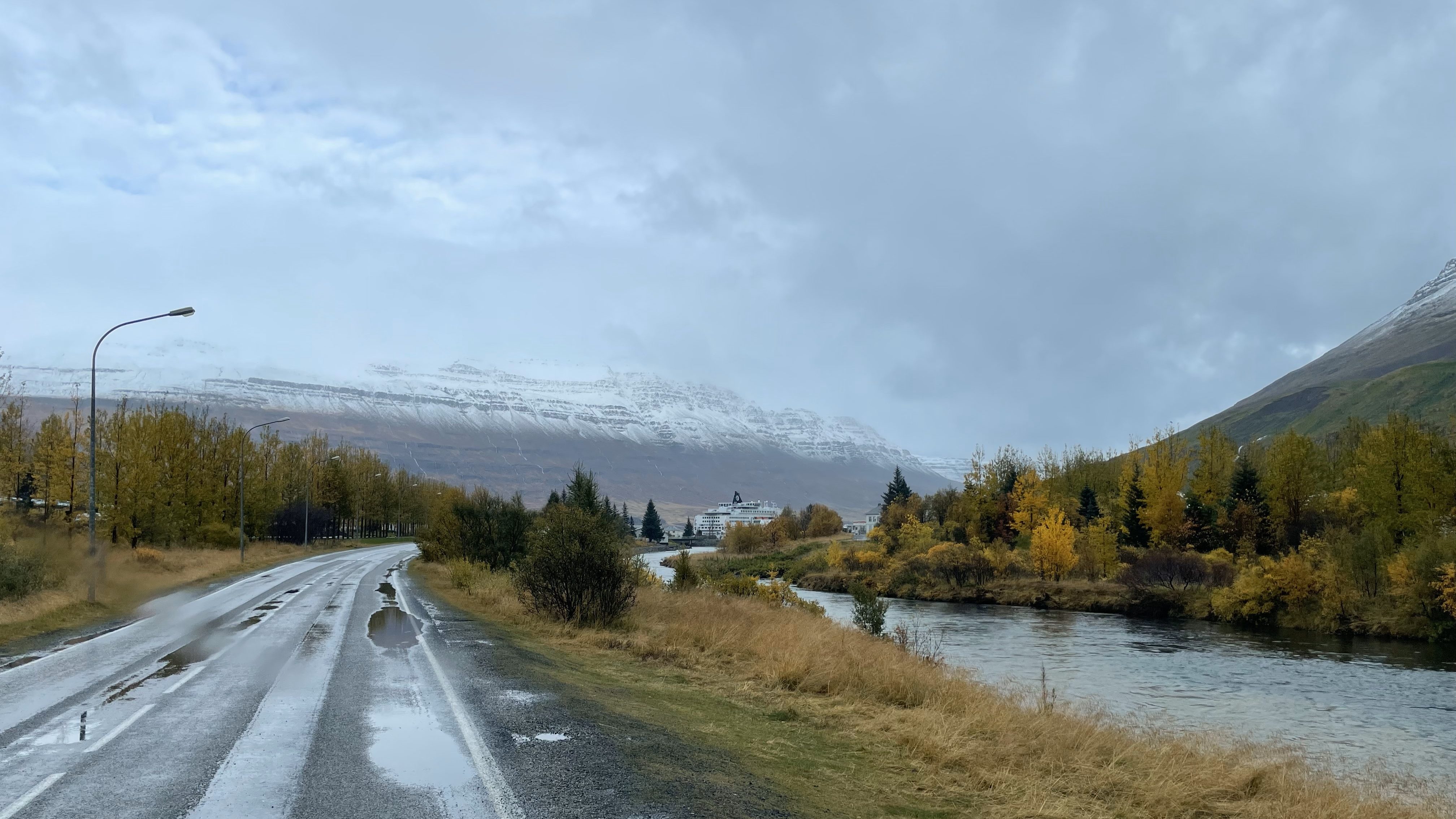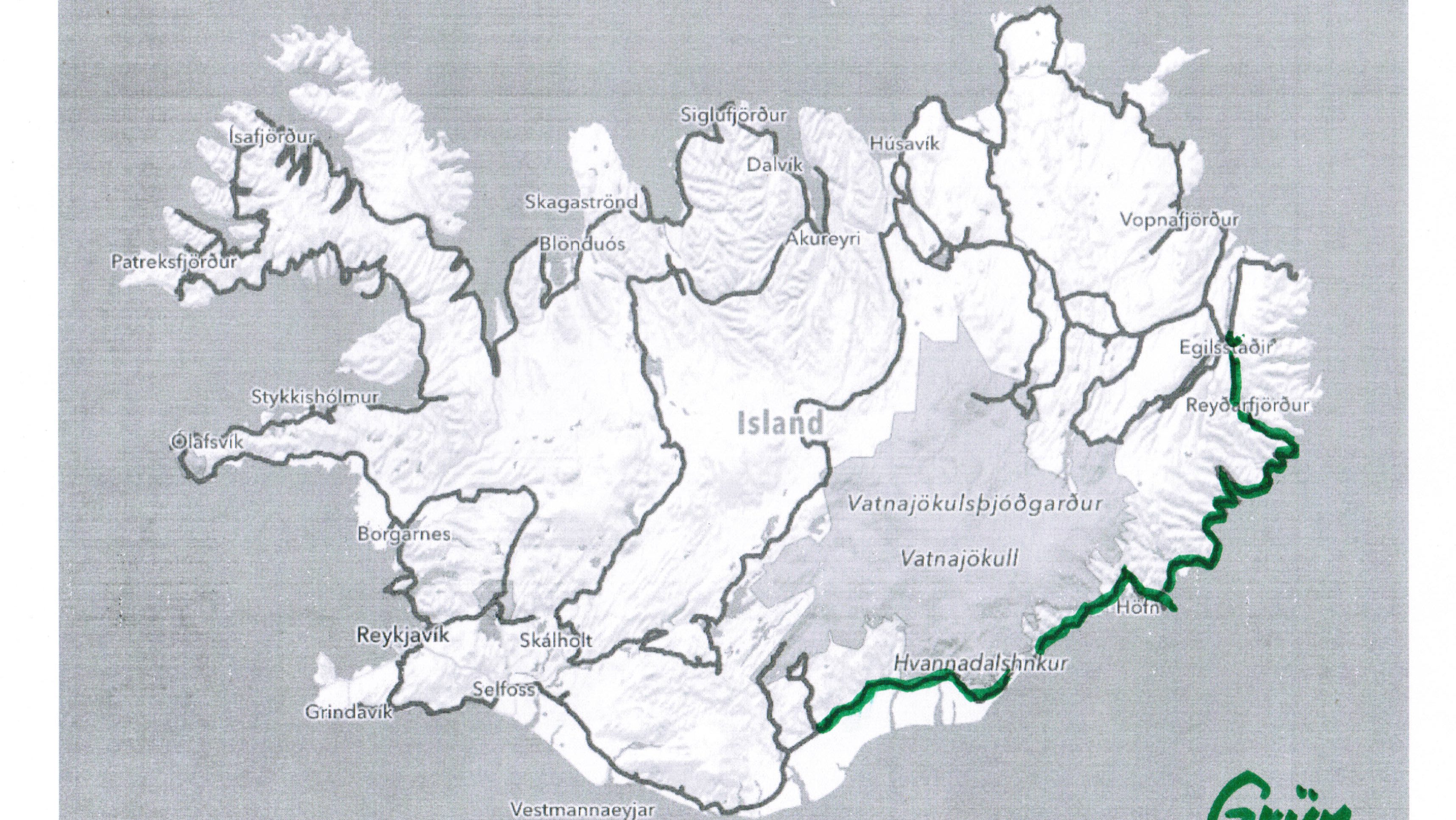 Anderntags zeigt sich die Sonne leider nicht und die mit Neuschnee bedeckten Berggipfel hüllen sich in dichten Nebel. Unsere heutige Fahrt wird uns auf der 917 über den Pass Hellisheiði Eystri auf die andere Seite des Gebirgszuges, dann der Jökla entlang zur Ringstrasse und weiter nach Egilstadir bringen.