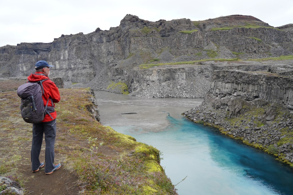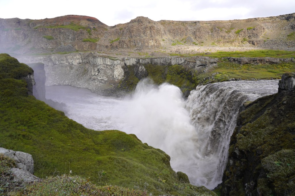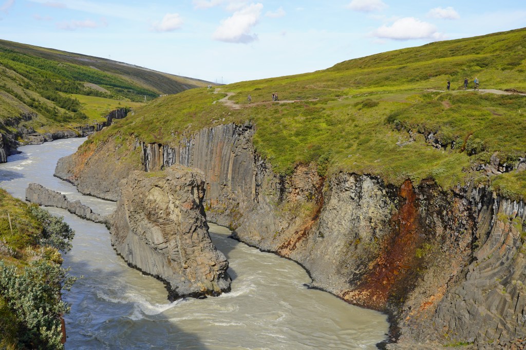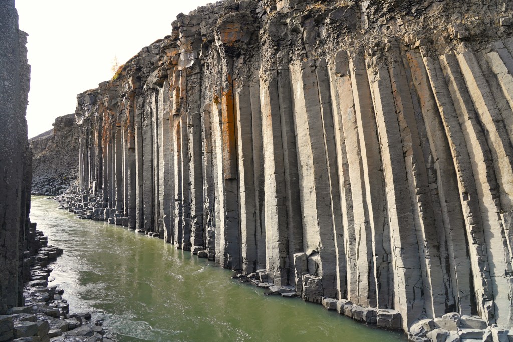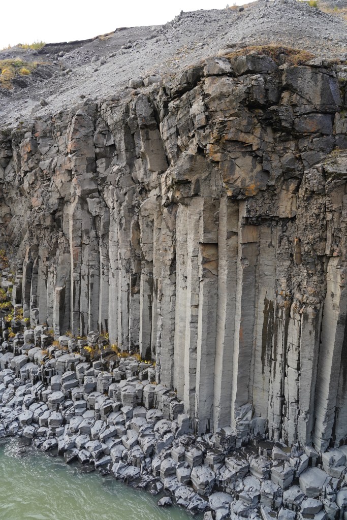 Auf dem Rückweg zur Ringstrasse liegt der Pass immer noch im Nebel und es regnet. Auf der anderen Seite der Bergkette scheint die Sonne milchig durch die Wolkendecke. Dank der durchwegs asphaltierten Strasse sind wir bald zurück in Egilstadir und befinden uns somit nicht allzu weit von der Schlucht Stuðlagil. In der Hoffnung, dass die Basaltsäulen jetzt in ihrer ganzen Länge zu sehen sind, beschliessen wir, die Schlucht nochmals aufzusuchen. Nach ca. einer Stunde zügiger Fahrt und einem Spaziergang von etwa drei Kilometern entlang der Jökla erreichen wir die ca. 500 Meter lange Schlucht. Und wirklich zeigen sich die spektakulären Säulen in ihrer ganzen Pracht. Ein beeindruckendes Schauspiel, das uns die Natur hier bietet – allerdings kräftig unterstützt vom Energiebedarf Islands…