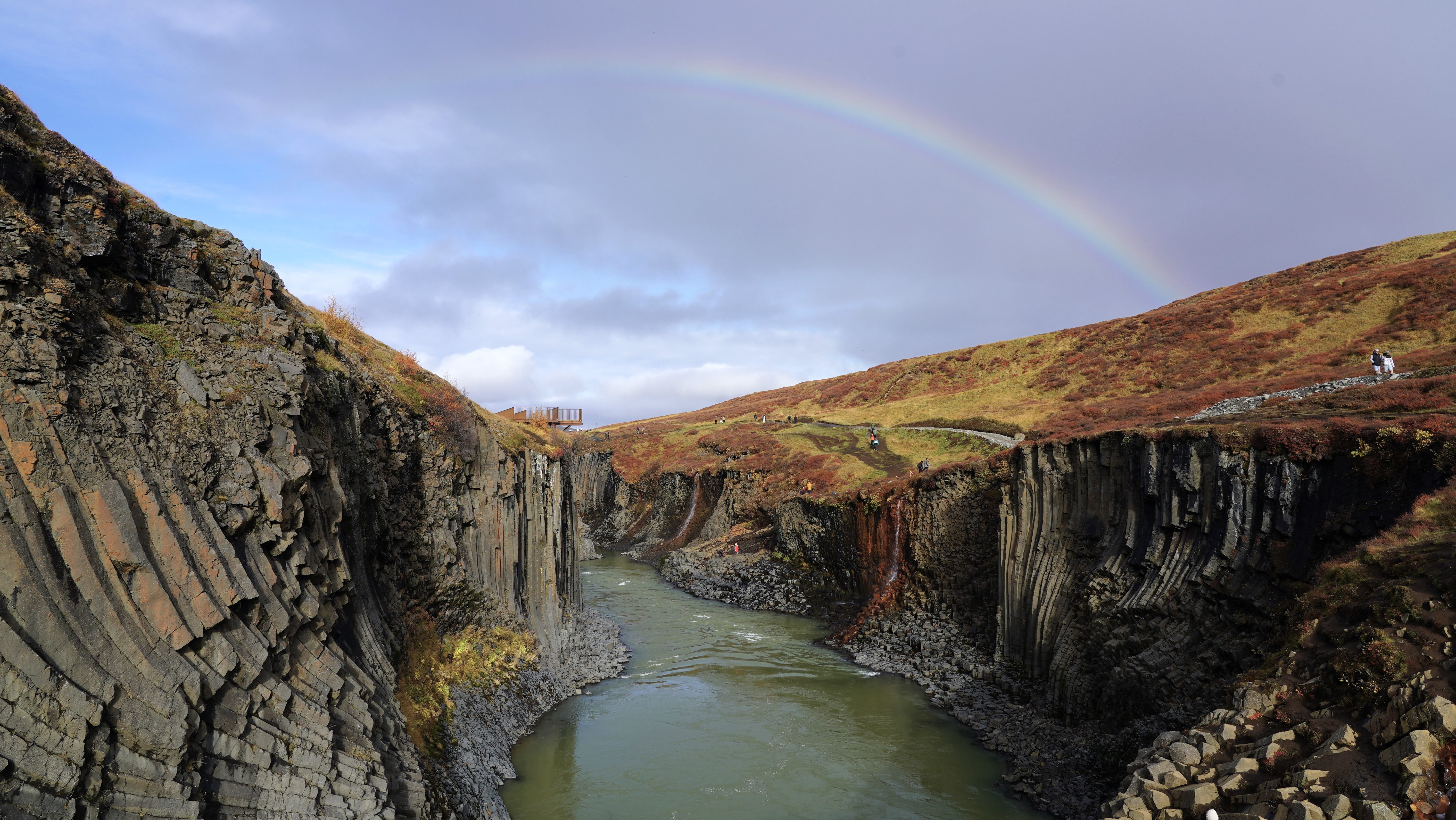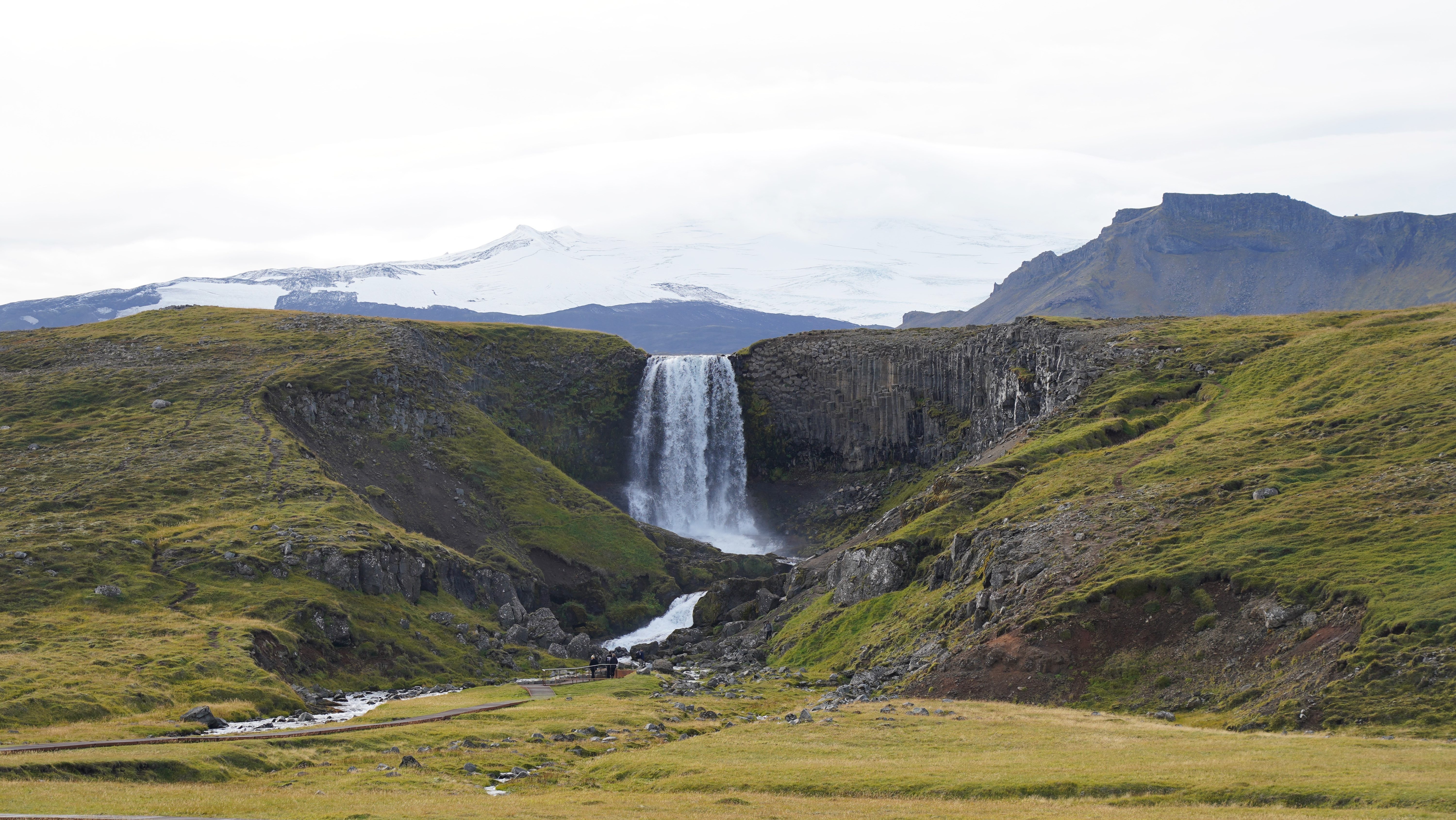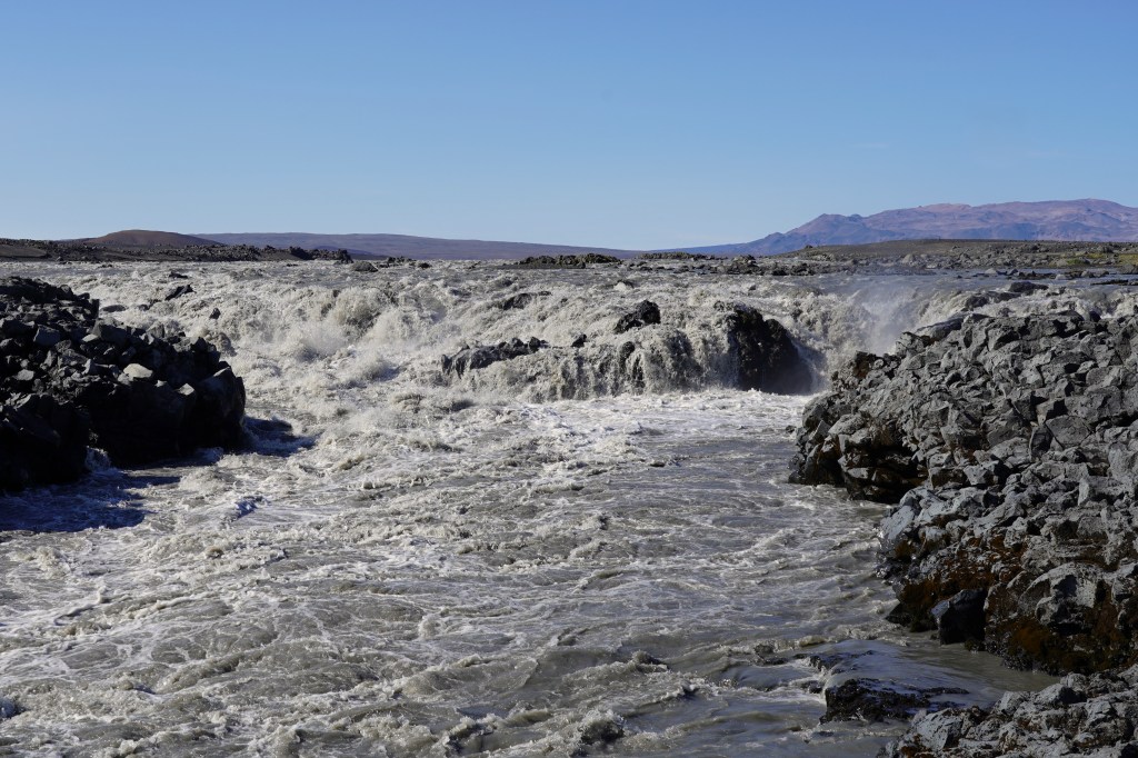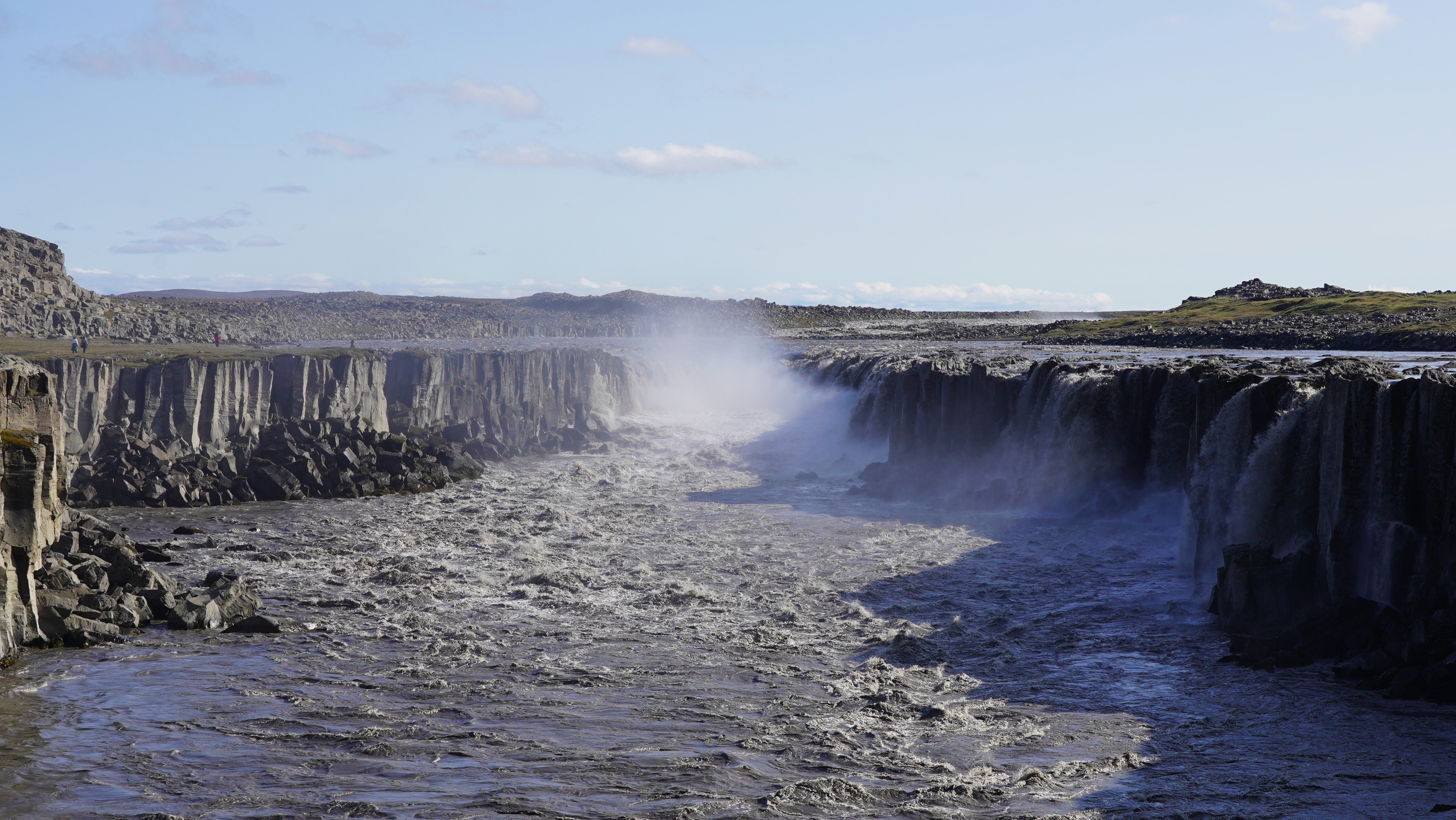 Auf dem Rückweg zur Ringstrasse liegt der Pass immer noch im Nebel und es regnet. Auf der anderen Seite der Bergkette scheint die Sonne milchig durch die Wolkendecke. Dank der durchwegs asphaltierten Strasse sind wir bald zurück in Egilstadir und befinden uns somit nicht allzu weit von der Schlucht Stuðlagil. In der Hoffnung, dass die Basaltsäulen jetzt in ihrer ganzen Länge zu sehen sind, beschliessen wir, die Schlucht nochmals aufzusuchen. Nach ca. einer Stunde zügiger Fahrt und einem Spaziergang von etwa drei Kilometern entlang der Jökla erreichen wir die ca. 500 Meter lange Schlucht. Und wirklich zeigen sich die spektakulären Säulen in ihrer ganzen Pracht. Ein beeindruckendes Schauspiel, das uns die Natur hier bietet – allerdings kräftig unterstützt vom Energiebedarf Islands…