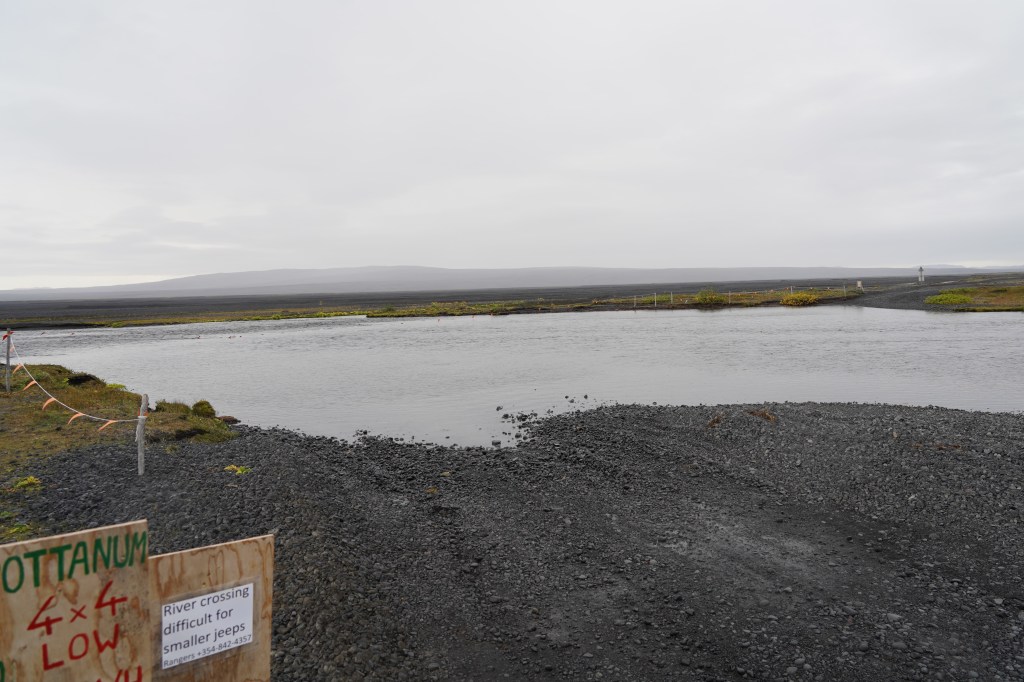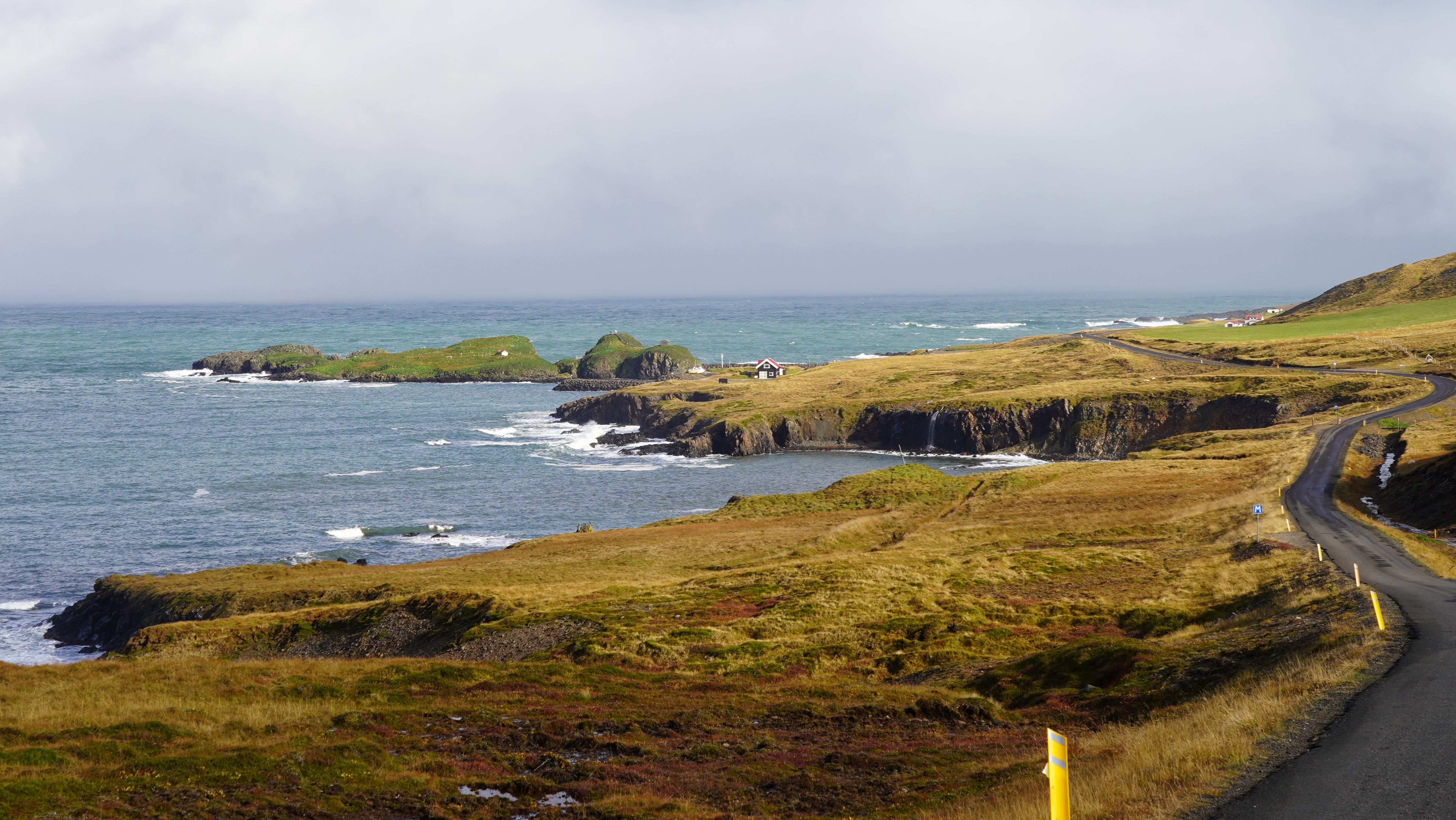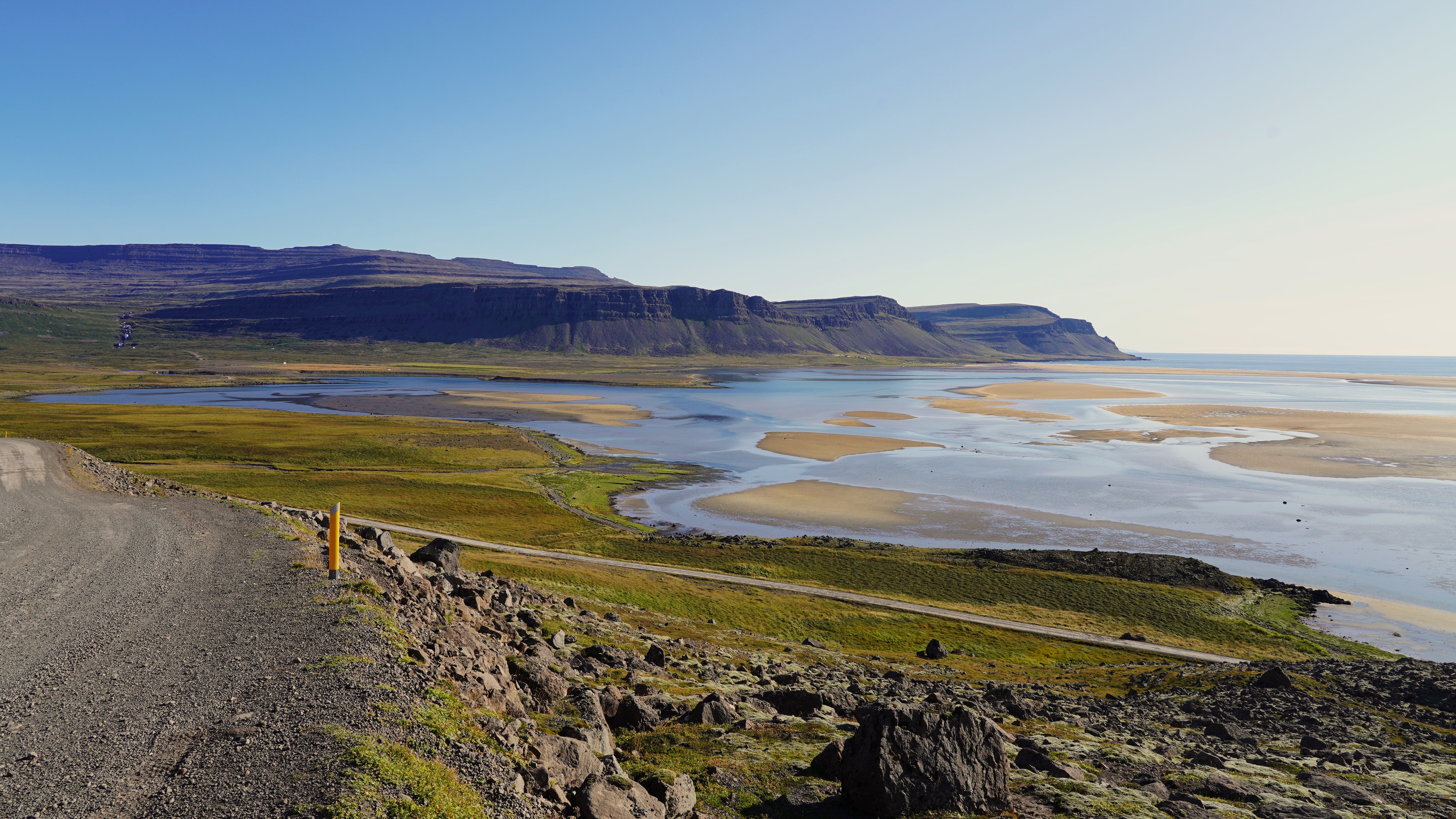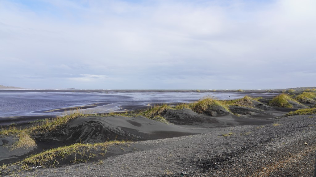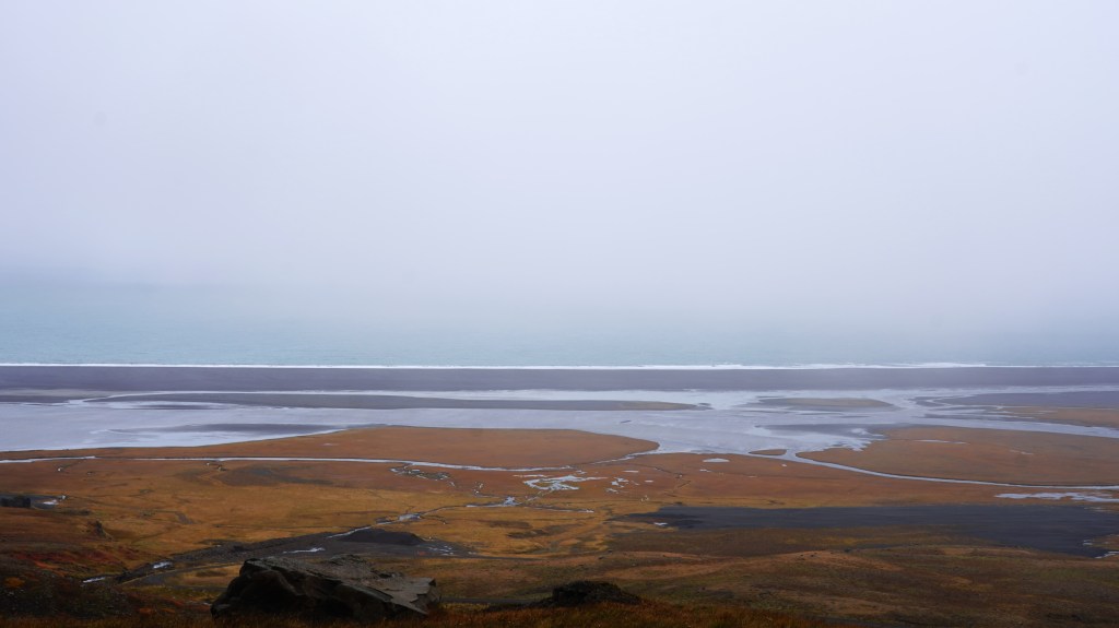 Nach diesem angenehmen Auftakt in den neuen Tag geht es zurück auf die 917. Die asphaltierte Strasse geht nach ein paar Kilometern in eine befestigte Piste über. Diese führt in engen Kurven und mit Steigungen von bis zu 15% auf den schneebedeckten Pass. Genauso steil und eng geht es auf der anderen Seite zurück auf Meereshöhe. Unterhalb der Nebelgrenze überrascht uns eine grossartige Sicht auf die Bucht Héraðsflói, den ca. 25 Kilometer langen tiefschwarzen Strand Héraðssandar und das weiträumige Delta, das von den Flüssen Jökla, Lagarfljót und Selfljót geschaffen wurde, die hier in die Grönlandsee münden.