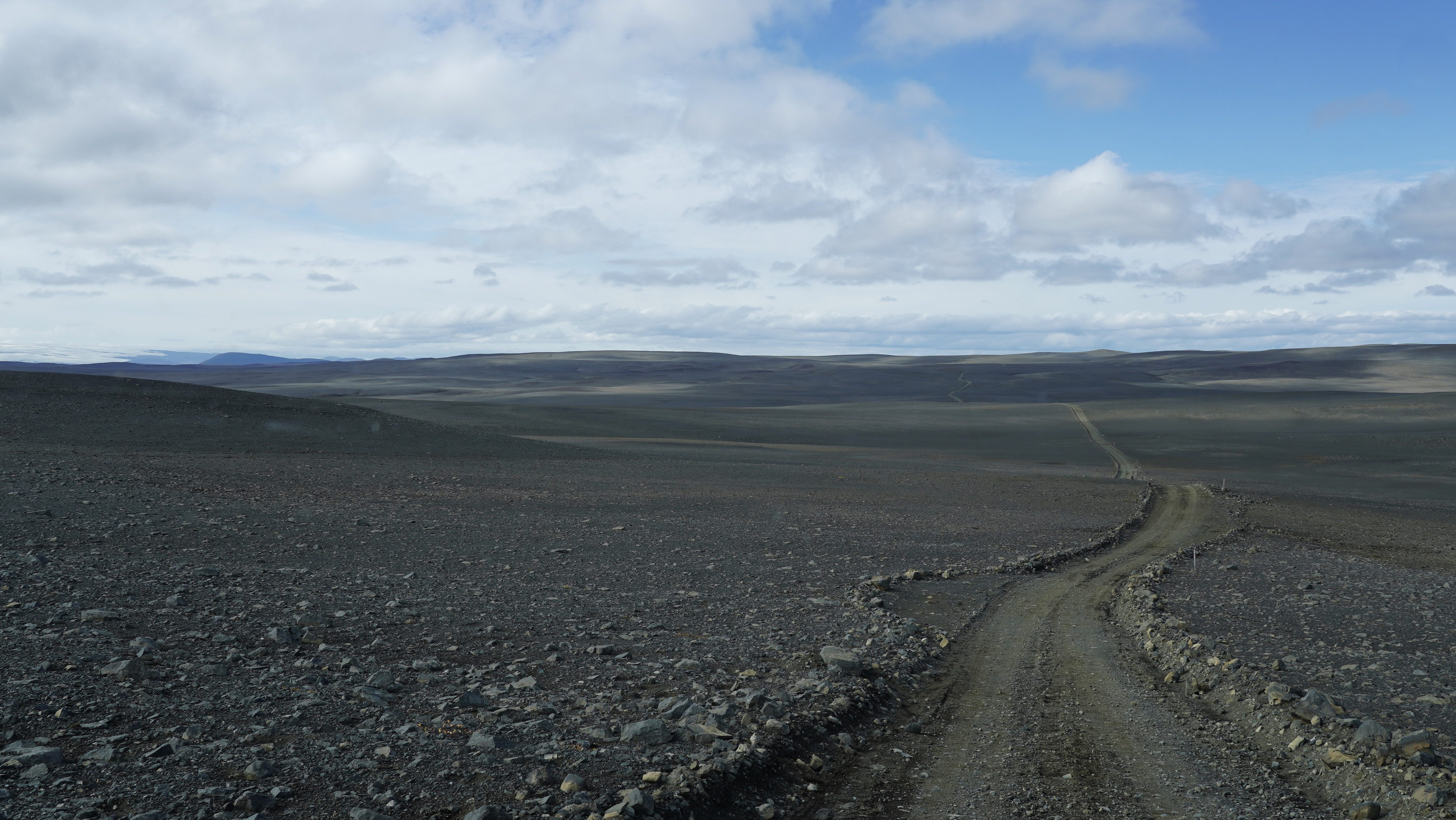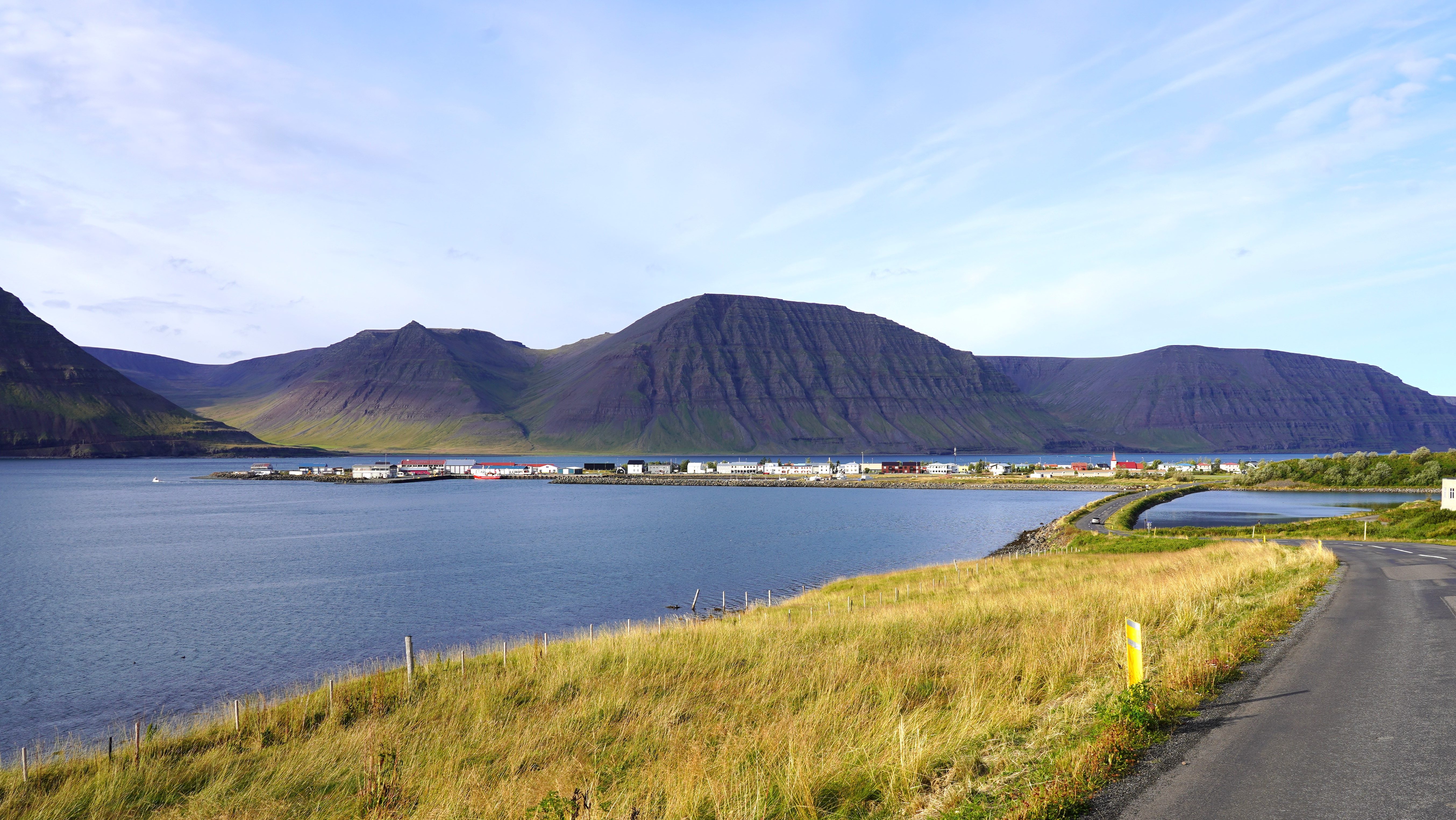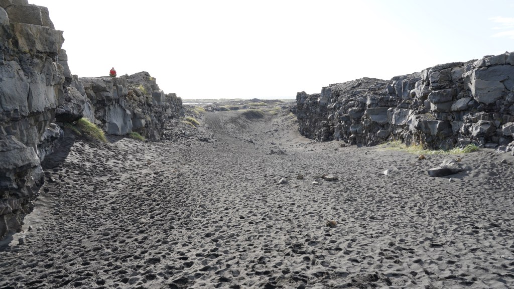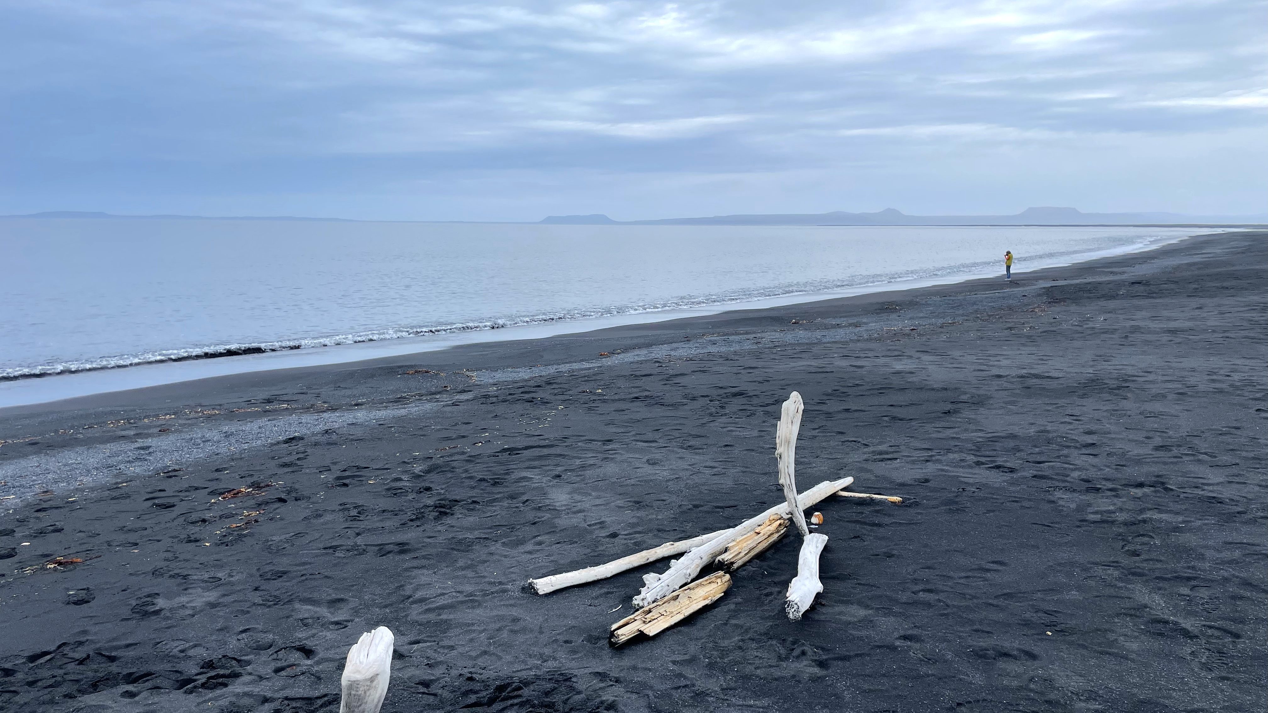 Nach diesem angenehmen Auftakt in den neuen Tag geht es zurück auf die 917. Die asphaltierte Strasse geht nach ein paar Kilometern in eine befestigte Piste über. Diese führt in engen Kurven und mit Steigungen von bis zu 15% auf den schneebedeckten Pass. Genauso steil und eng geht es auf der anderen Seite zurück auf Meereshöhe. Unterhalb der Nebelgrenze überrascht uns eine grossartige Sicht auf die Bucht Héraðsflói, den ca. 25 Kilometer langen tiefschwarzen Strand Héraðssandar und das weiträumige Delta, das von den Flüssen Jökla, Lagarfljót und Selfljót geschaffen wurde, die hier in die Grönlandsee münden.