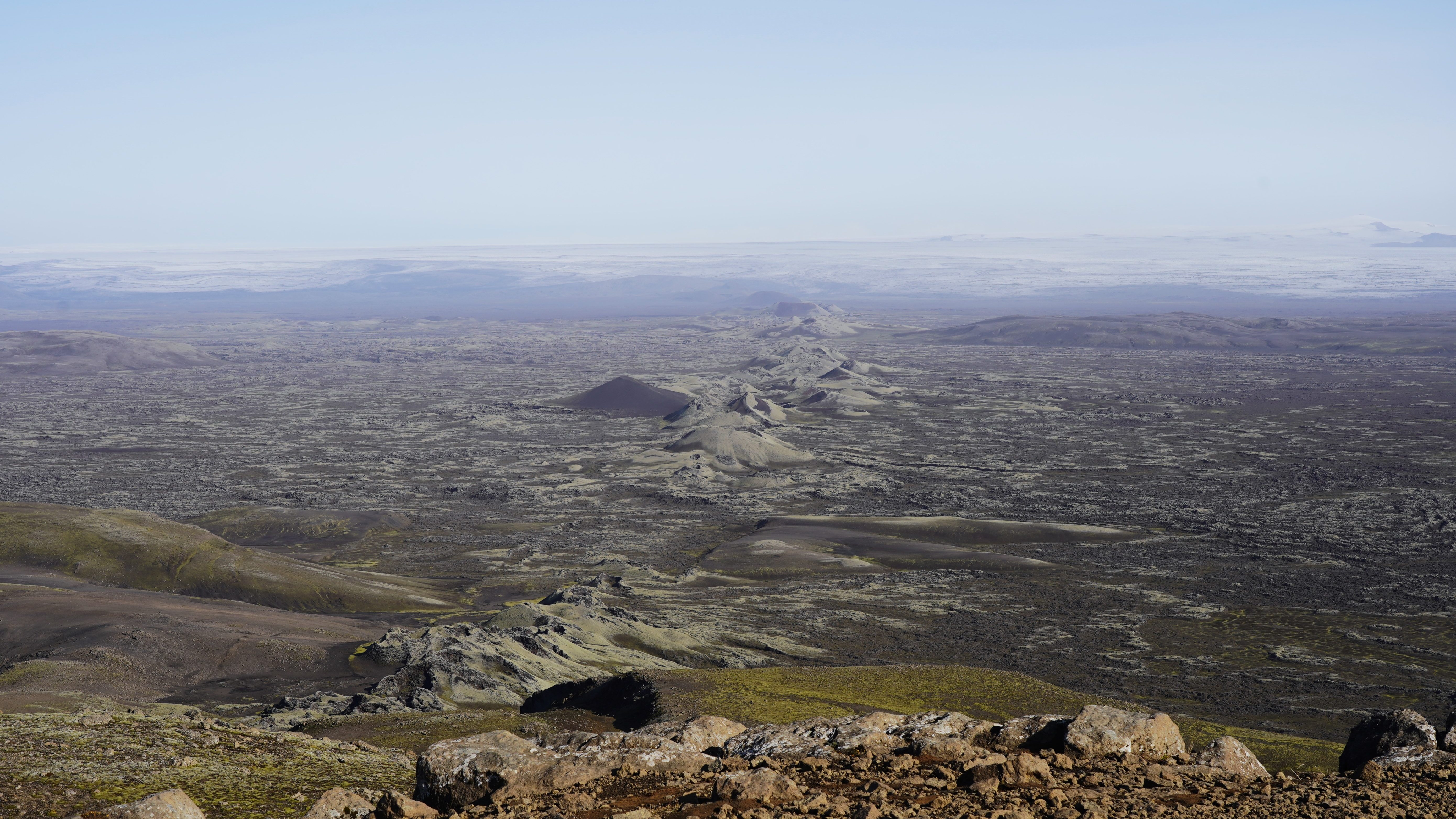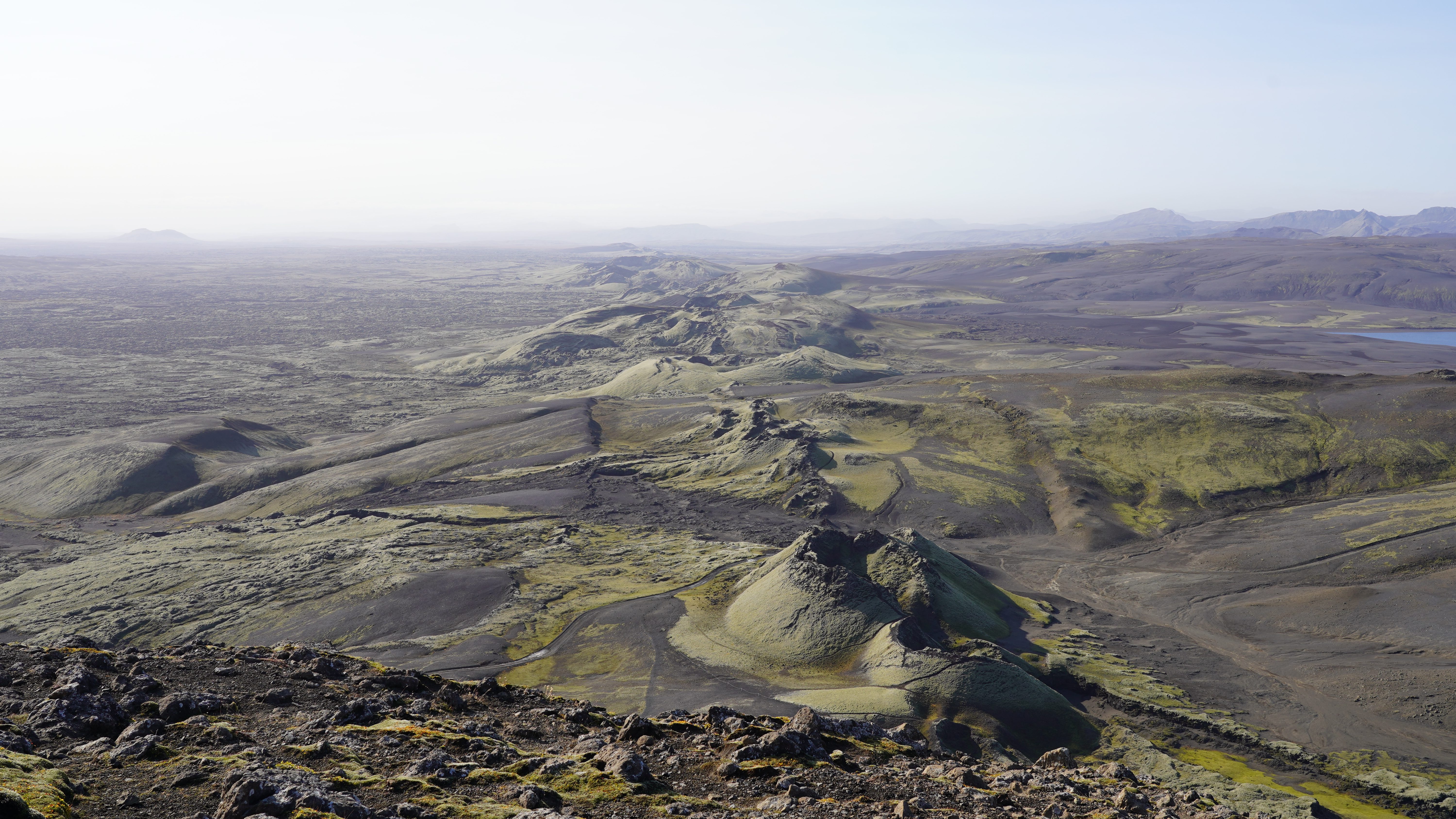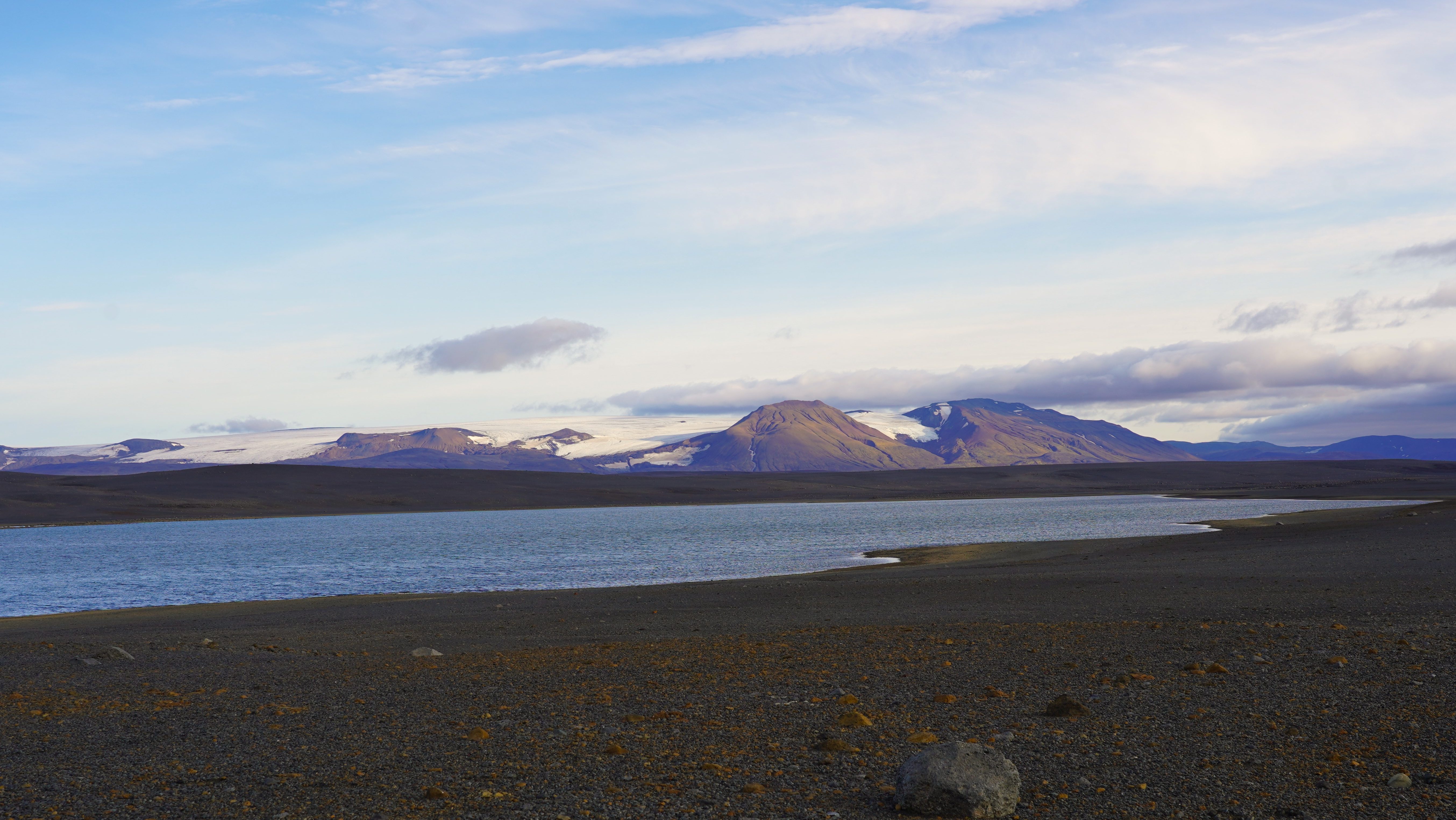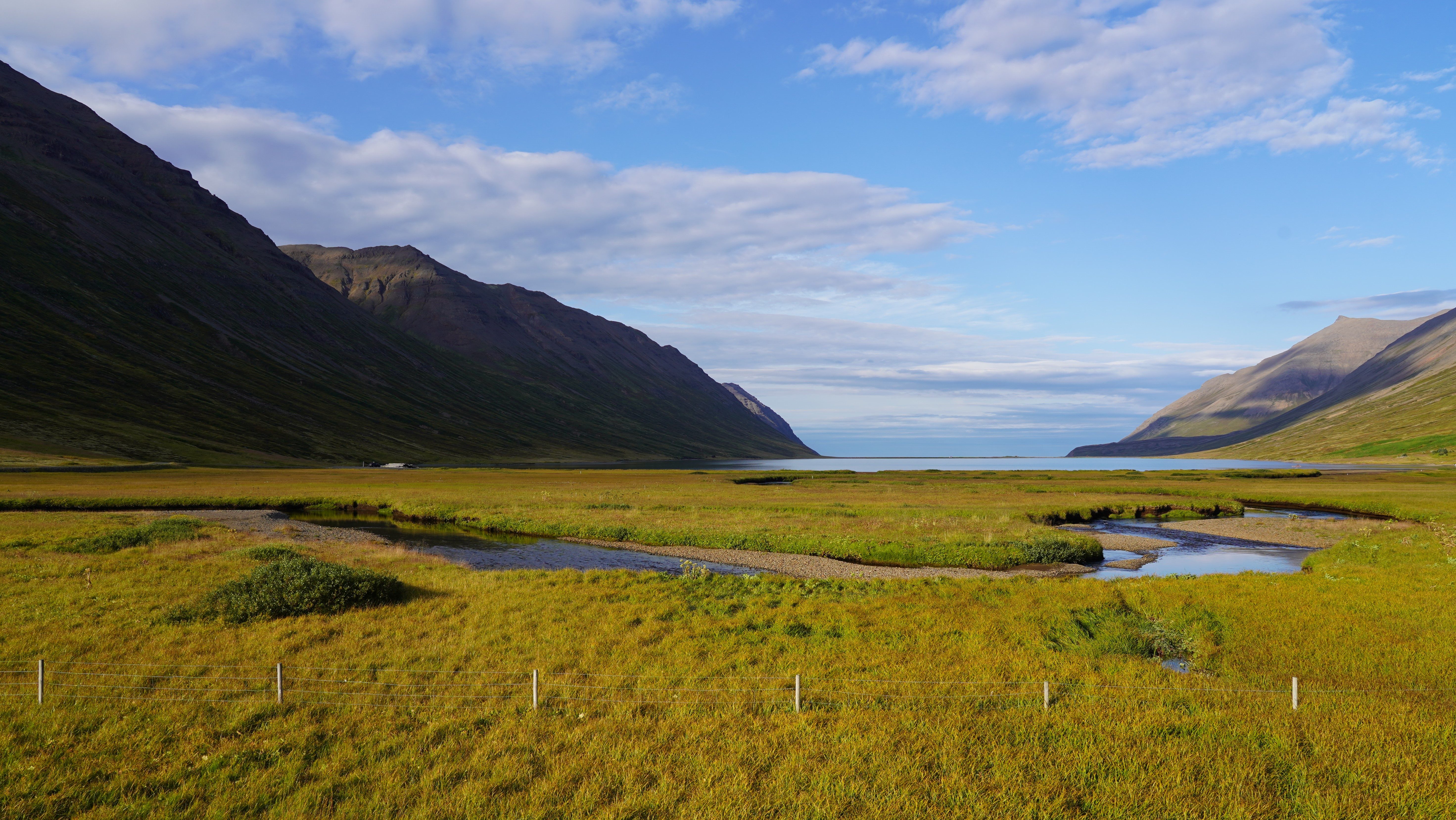 Nach diesem angenehmen Auftakt in den neuen Tag geht es zurück auf die 917. Die asphaltierte Strasse geht nach ein paar Kilometern in eine befestigte Piste über. Diese führt in engen Kurven und mit Steigungen von bis zu 15% auf den schneebedeckten Pass. Genauso steil und eng geht es auf der anderen Seite zurück auf Meereshöhe. Unterhalb der Nebelgrenze überrascht uns eine grossartige Sicht auf die Bucht Héraðsflói, den ca. 25 Kilometer langen tiefschwarzen Strand Héraðssandar und das weiträumige Delta, das von den Flüssen Jökla, Lagarfljót und Selfljót geschaffen wurde, die hier in die Grönlandsee münden.