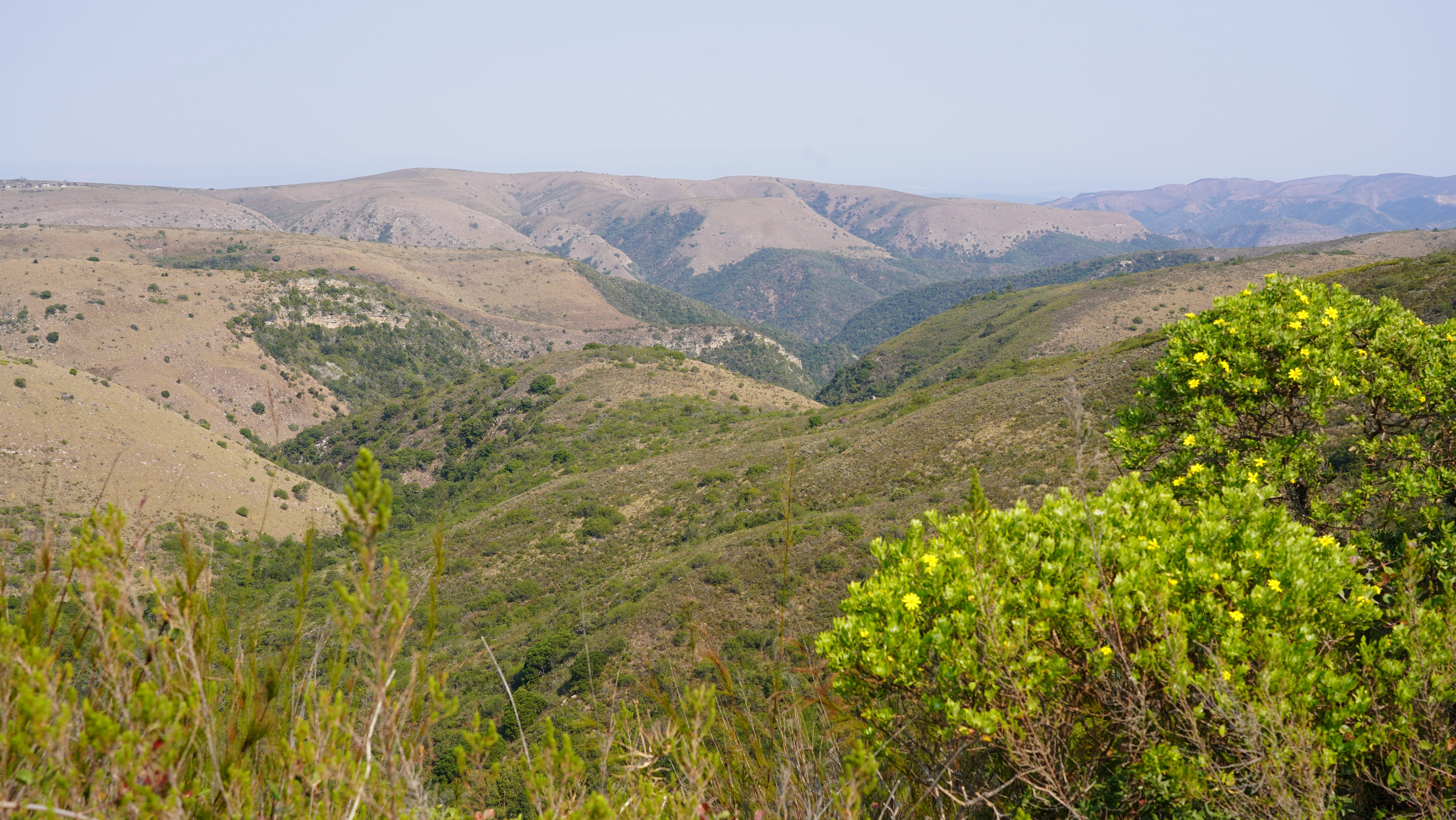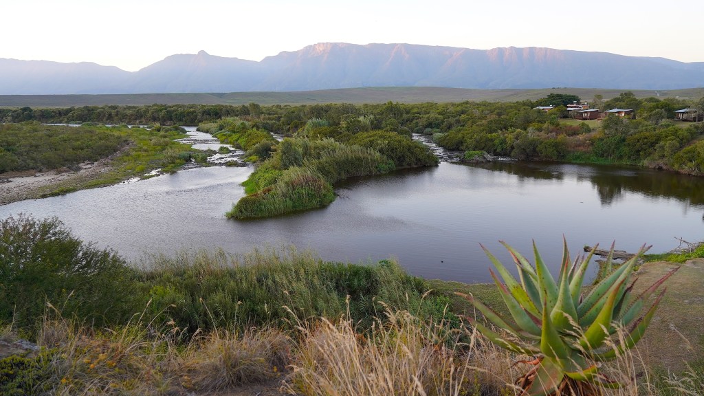Auf unserem Weg von Swellendam nach Mossel Bay und weiter nach George durchqueren wir fruchtbare sattgrüne Gegenden. Die hügeligen, oft wasserreichen Gebiete am Fuss der weit im Hintergrund liegenden Langeberg- und Swartbergebirge sowie den Outeniqua Bergen präsentieren sich neben dem üblichen landwirtschaftlichen Kulturen mit weitflächigem Weideland und riesigen Vieherden sowie ausgedehnten Wäldern. Eine Landschaft, die uns immer wieder an die Schweiz erinnert, obwohl ein direkter Vergleich angesichts der hiesigen Dimensionen nicht wirklich sinnvoll ist.