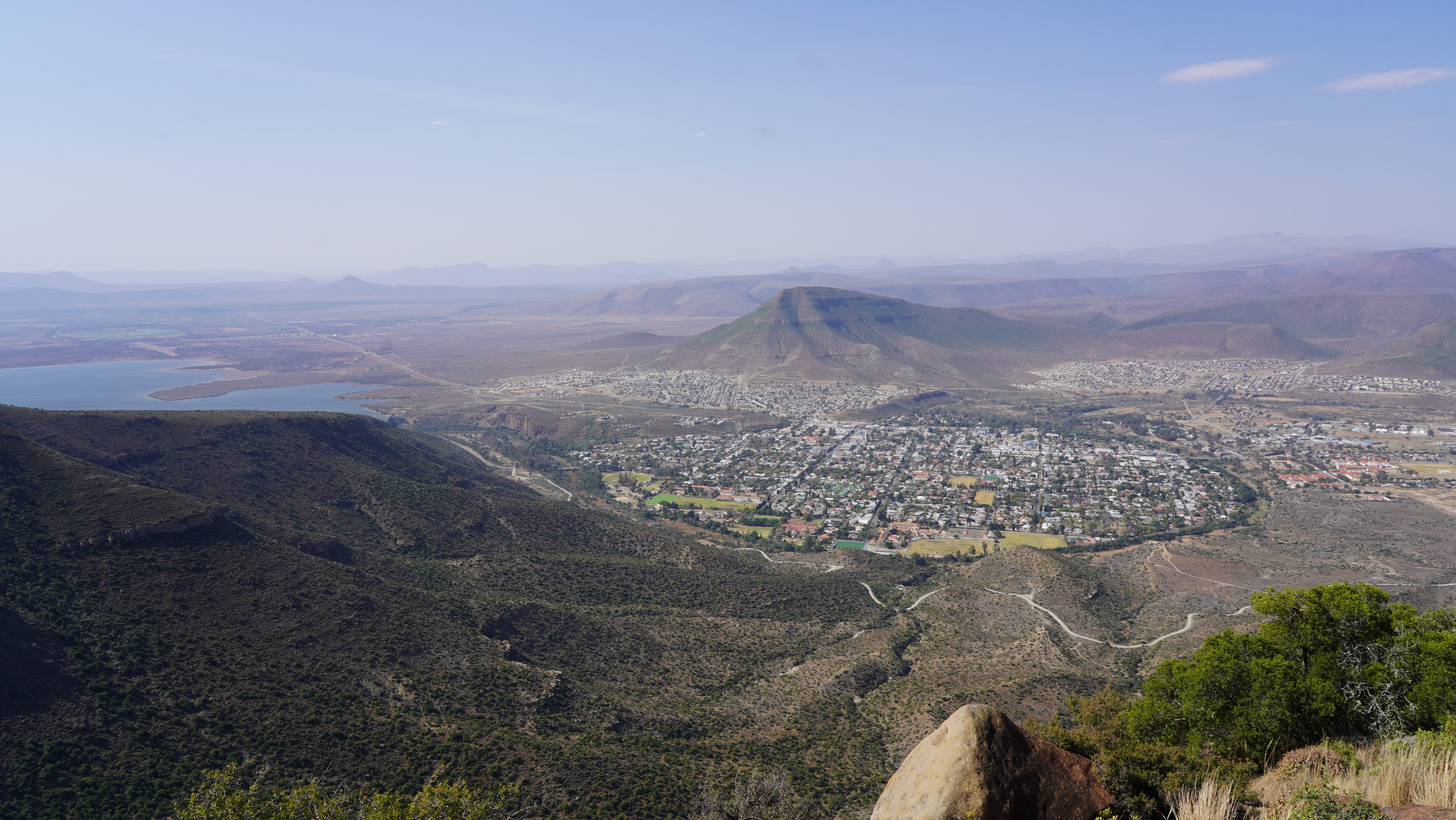 Mit Ziel Port Elisabeth fahren wir vom Mountain Zebra National Park nach Süden. Dabei besuchen wir das malerische Städtchen Graaff Reinet, das wir zu Beginn unserer Reise schon besichtigt haben, noch einmal. Im Gegensatz zu unserem Besuch im Frühling präsentiert sich die damals strohtrockene Gegend um Graaff Reinett nach ausgiebigem Regen in sattem Grün.