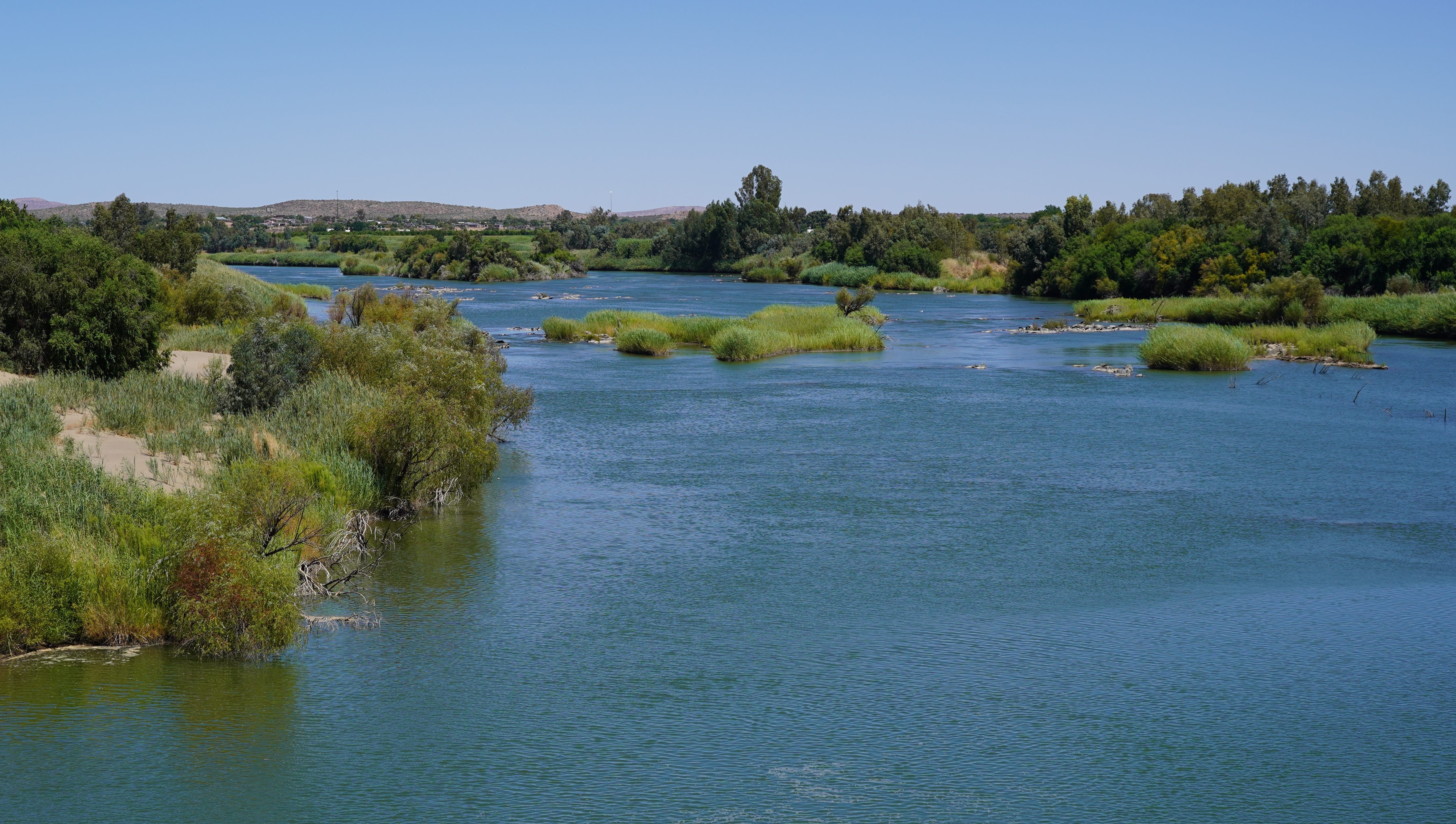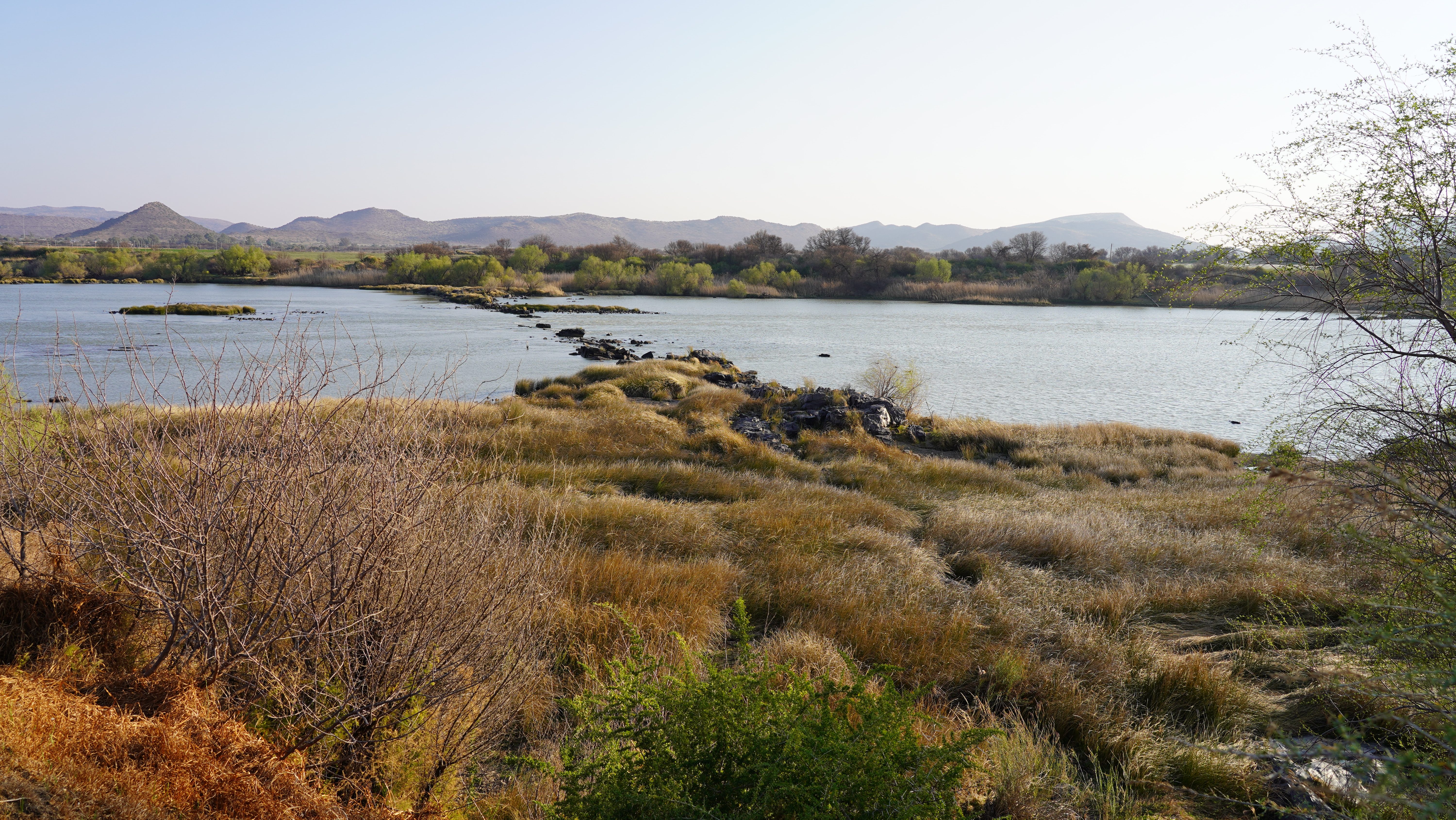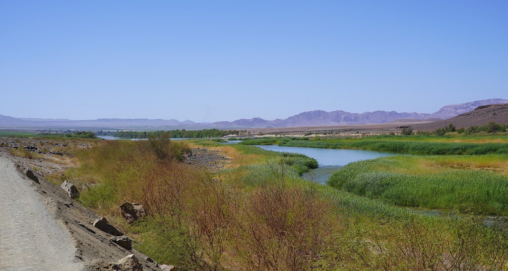 Begleitet von einem Gewitter mit starkem Regen fahren wir also nach Orania. Als wir den Ort erreichen, hat der Regen aufgehört und ein Regenbogen heisst uns in einer auffallend ordentlichen Ortschaft mit gut unterhaltener Infrastruktur und gepflegten privaten Liegenschaften willkommen. Die Campsite des Ortes liegt am Ufer des Orange Rivers am Rand einer Hotel- und Chaletanlage.