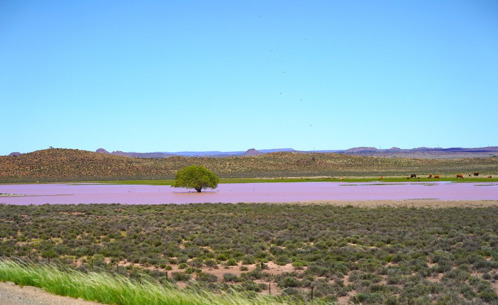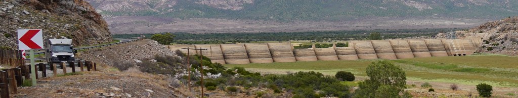 Etwa 30 Kilometer nach Willowmore passieren wir den Beervlei Staudamm. Der 31 Meter hohe und 348 Meter lange Damm wurde 1957 gebaut, um Überflutungen durch den Groot River und dessen Zuflüsse zu verhindern. Bei starken Regenfällen füllt sich die 23’145 Km2 grosse Stauebene mit Wasser, das in der Folge durch gezieltes Öffnen der Schleusen zur Bewässerung der Felder zur Verfügung gestellt wird.