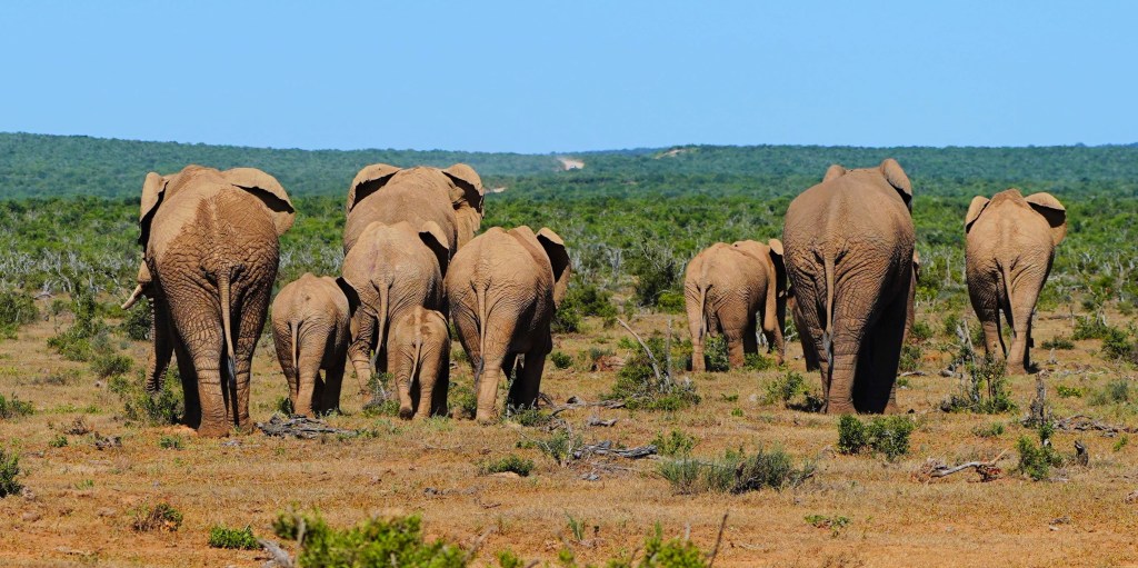 Quasi an unserer Route liegt einige Zeit später der Addo Elephant National Park. Natürlich schaffen wir es nicht, am Park vorbeizufahren und damit die Gelegenheit zu verpassen, noch einmal Elefanten aus nächster Nähe beobachten zu können.